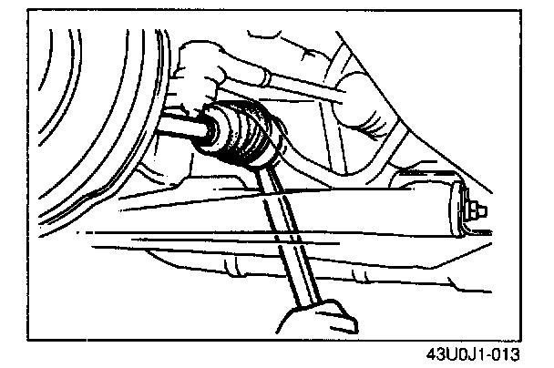 4. Separate the drive shaft from the transaxle by prying with a bar inserted between the outer ring and the transaxle, as shown in the image.
