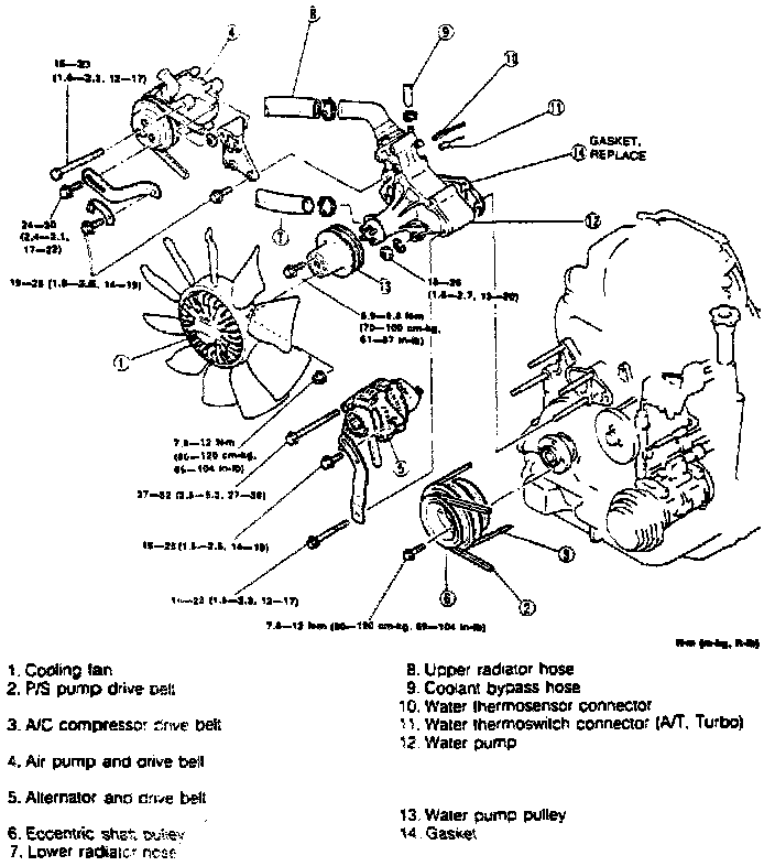 5. Remove eccentric shaft pulley, then disconnect upper and lower radiator hoses and the coolant bypass hose.