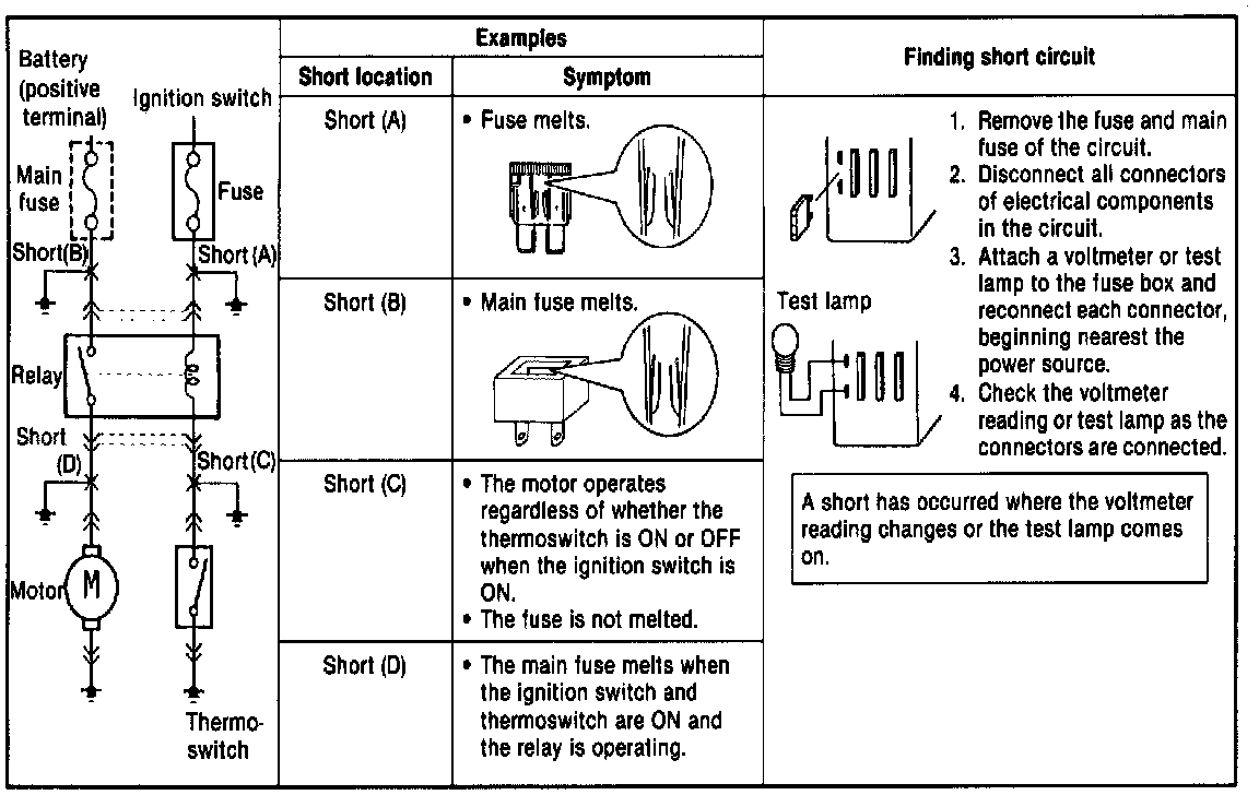 Shorts occur between the power (positive) and ground (negative) sides of a circuit. Therefore, finding a short circuit requires determining how the circuit is routed.Finding Short Circuits-Circuits Not Connected To Control Unit: