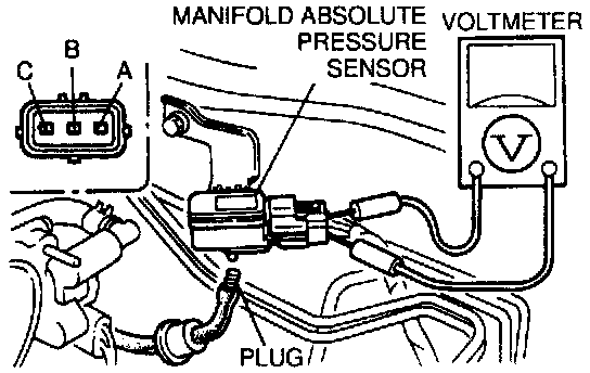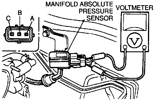 3. Connect a voltmeter between the manifold absolute pressure sensor terminal A and B and verify that the voltage is within specification.