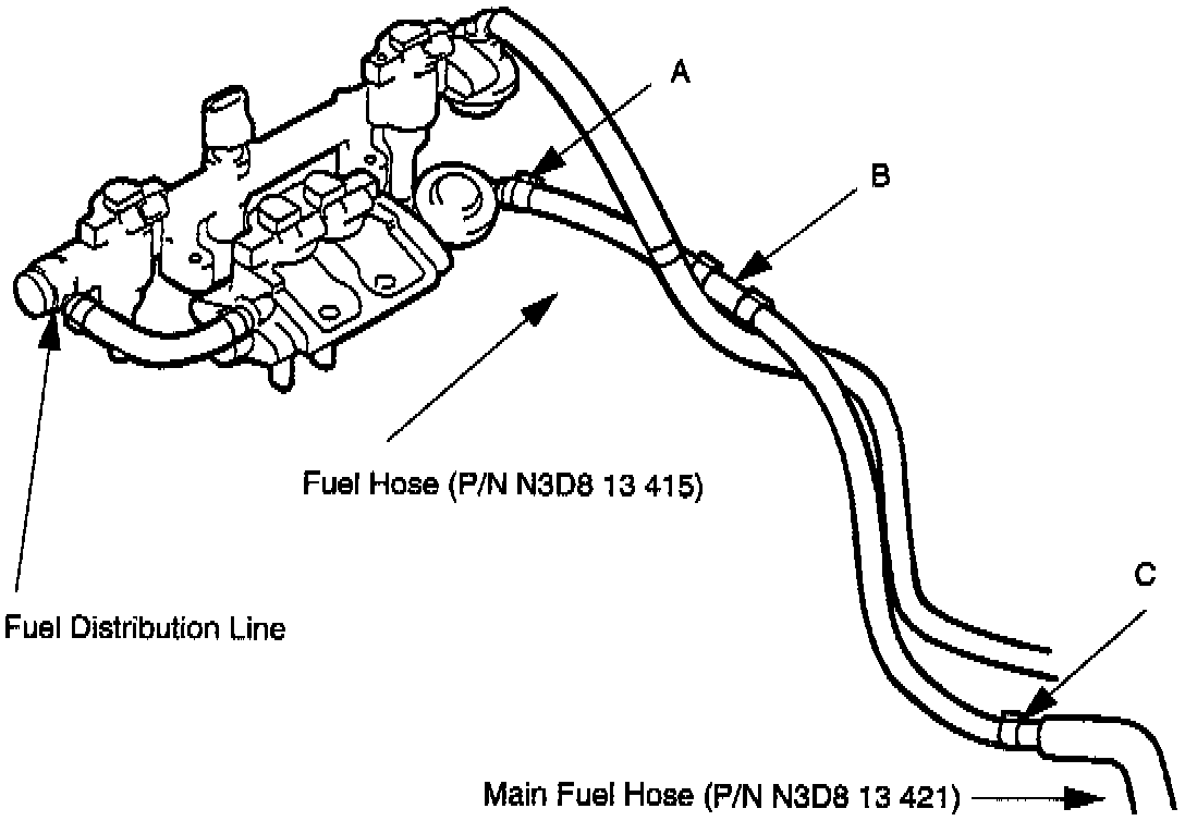 When removing an engine from any of the above mentioned vehicles, disconnect the main fuel line from the other side of the adhered spot (Refer to area "C").