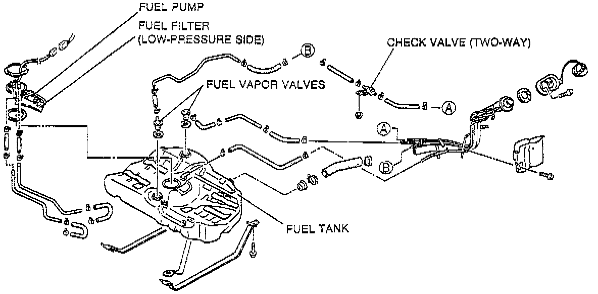 This system supplies the fuel to the fuel injectors at a constant pressure. Fuel is metered and injected into the [1][2]intake manifold according to injection control signals from the PCM. The system consists of the fuel tank, fuel pump, fuel filters, pressure regulator, pressure regulator control solenoid valve, fuel injectors, and fuel pump relay.
