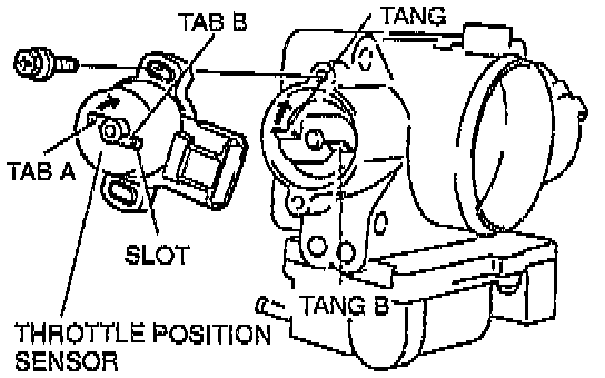 5. Open the throttle valve slightly and catch the tang of the throttle body on the throttle position sensor plastic tabs. Align tang A on throttle body with tab A on throttle position sensor. Note tangs on the throttle body mate with the tab on the throttle position sensor on the side of the tab without a slot.