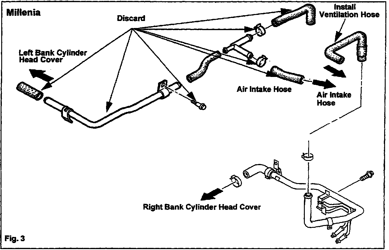 1. Discard the ventilation pipe and hose which are connected to the left bank cylinder head cover and connect the ventilation hose of Part No. KLK1 18 741A. Refer to figure 3 shown.