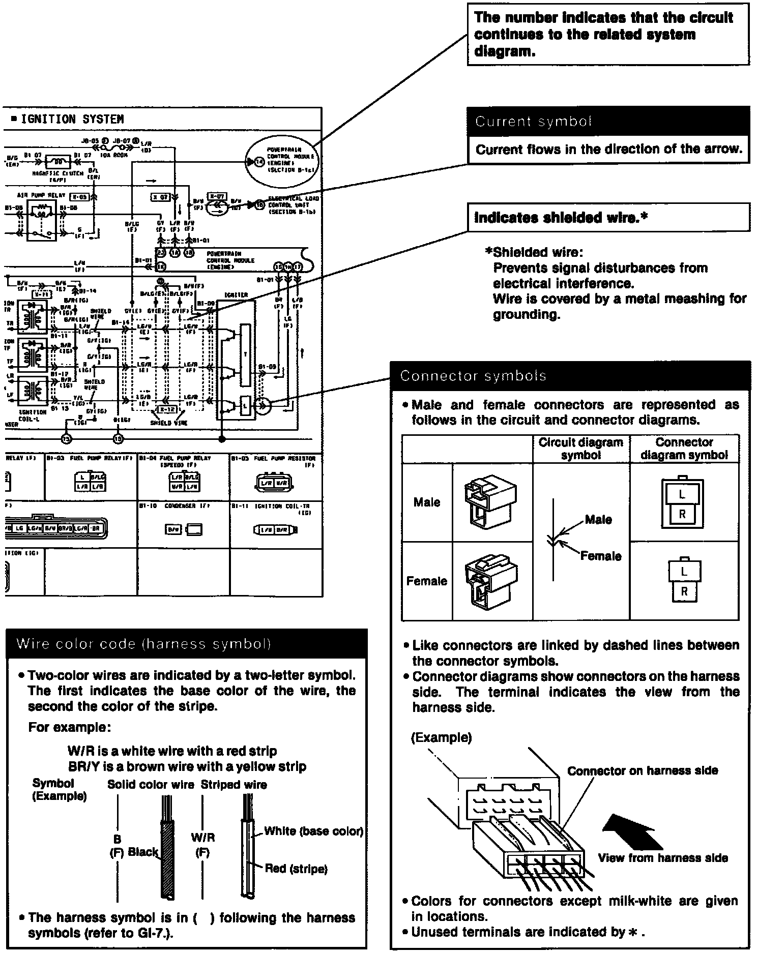 ^ These show the circuits for each system, from the power supply to the ground. The power supply side is on the upper part of the image, the ground side on the lower part. The diagrams describe circuits with the ignition switch off.