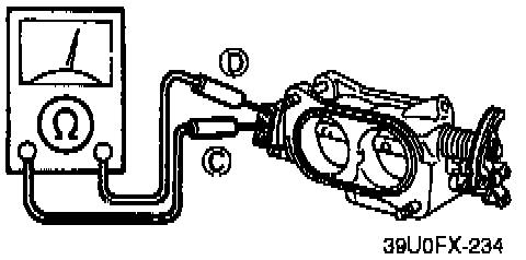 3. Check for continuity between C and D with a feeler gauge inserted between the throttle stop screw and throttle valve lever.