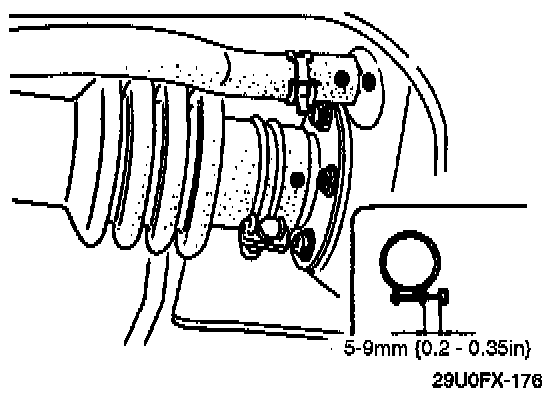 2. Push the fuel filler hose onto the fuel tank pipe and filler pipe at least 35 mm (1.4 in).
