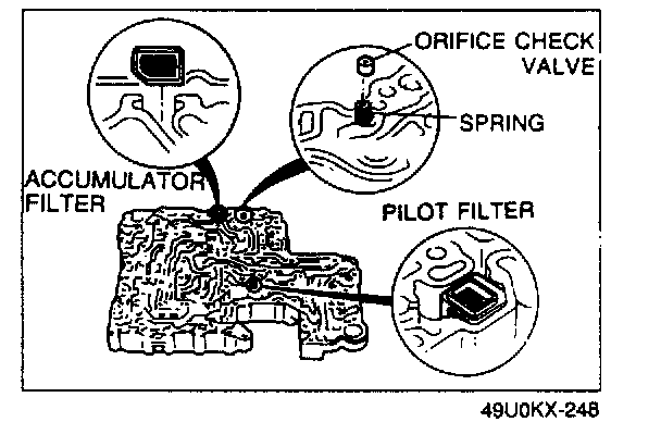 2. Install the pilot filter, accumulator filter, orifice check valve, and spring into their proper positions in the lower valve body.