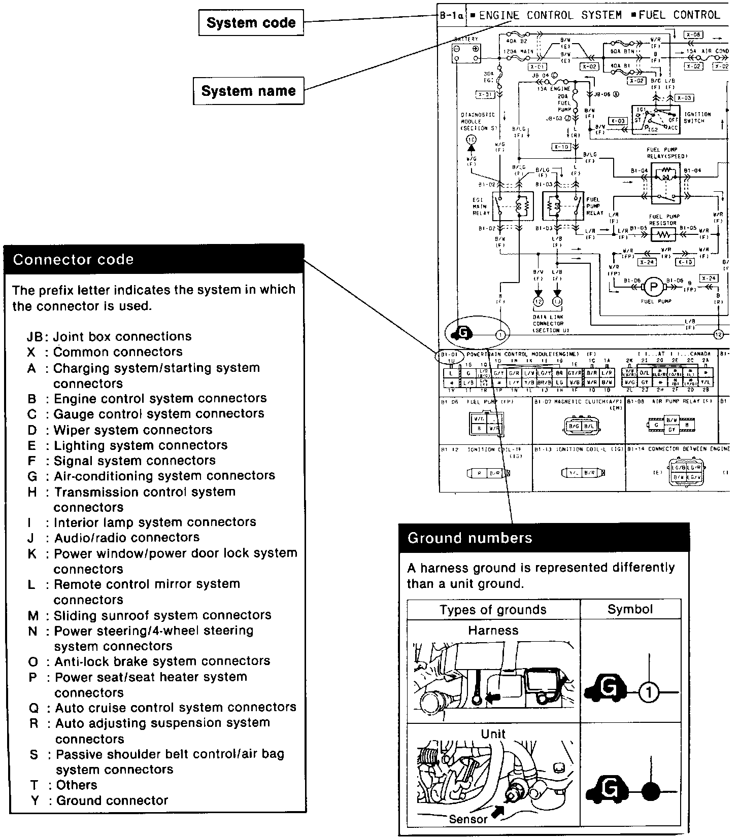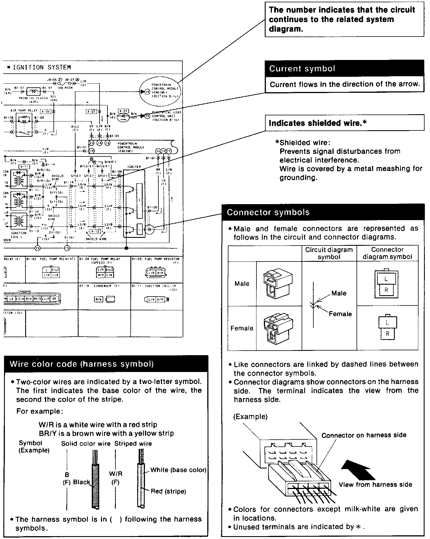 ^ These show the circuits for each system, from the power supply to the ground. The power supply side is on the upper part of the image, the ground side on the lower part. The diagrams describe circuits with the ignition switch off.