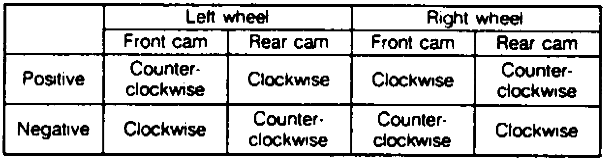 4. Turning front cam one graduation on scale changes caster angle about 1/3 of an inch and camber about 5/12 of an inch. Turning rear cam one graduation changes caster angle about 1/3 of an inch and camber about 1/30 of an inch.