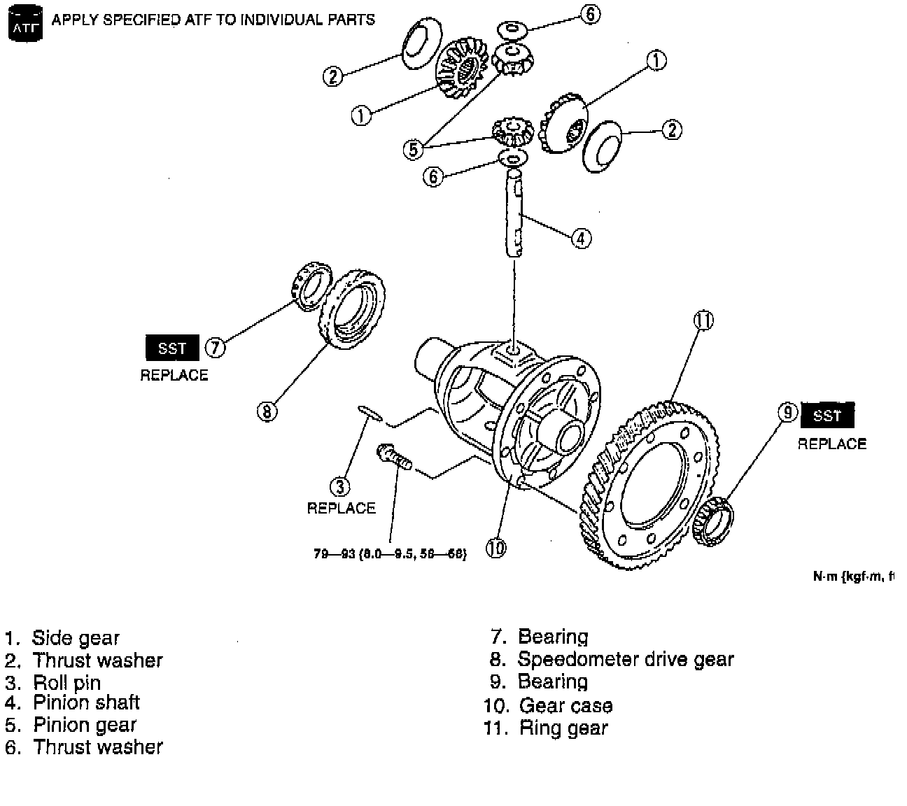 1. Before disassembly, measure the backlash of the side gears. Backlash standard is 0.05 - 0.15 mm (0.0020 - 0.0059 inch) and the maximum is 0.50 mm (0.020 inch).