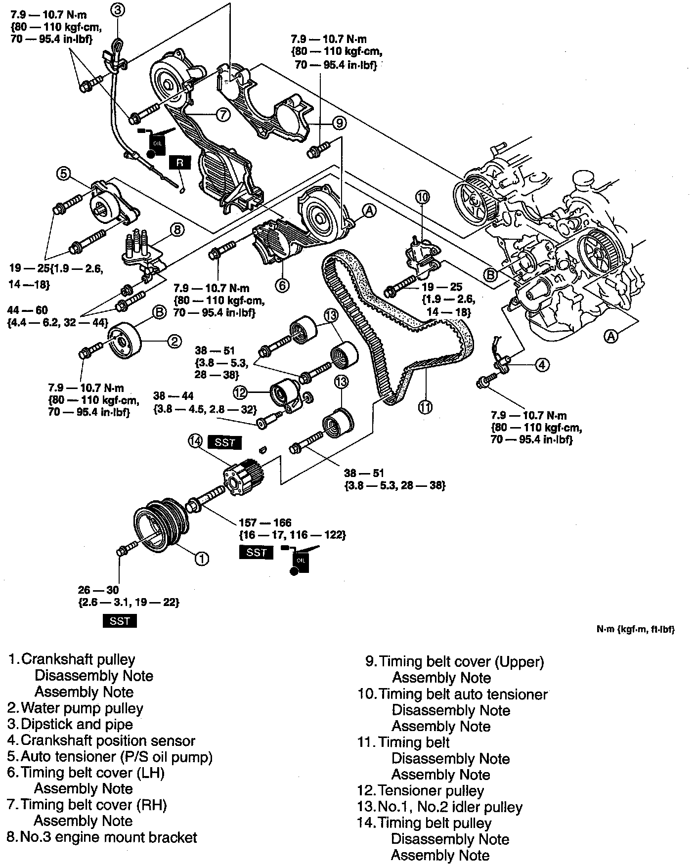 2. Install the timing belt on the pulleys in the order described below.