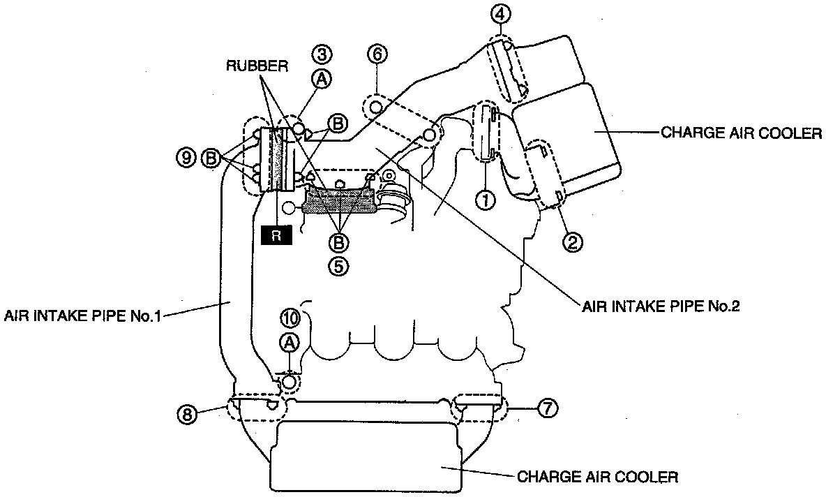 4. Hand tighten the nuts and bolts in the order shown until the charge air coolers and the air intake pipes No. 1 and No. 2 contact the intake manifold.