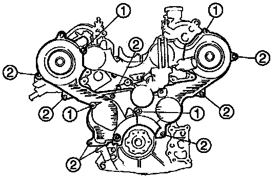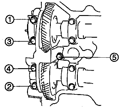 1. Loosen the front camshaft cap bolts in five or six steps in the order shown.