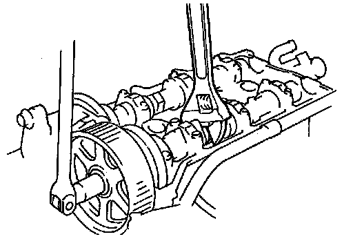 1. Hold the camshaft by using a wrench on the cast hexagon as shown, and loosen the camshaft pulley lock bolts.