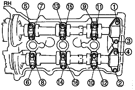 Hand tighten the bolts in five or six steps in the order shown, until the camshaft caps are fully seated on the cylinder heads.