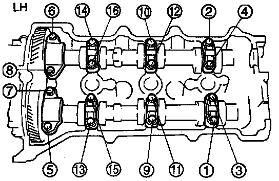 3. Loosen the camshaft cap bolts in five or six steps in the order shown.