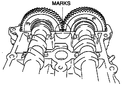 2. Install the camshafts so that intake camshaft gear painted mark and exhaust camshaft gear painted mark align.