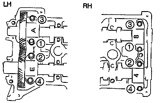 - Install the thrust caps first. (Caps marked "4" and "8" for RH, and caps marked "A" and "E" for LH) Otherwise, camshaft can be broken or damaged.