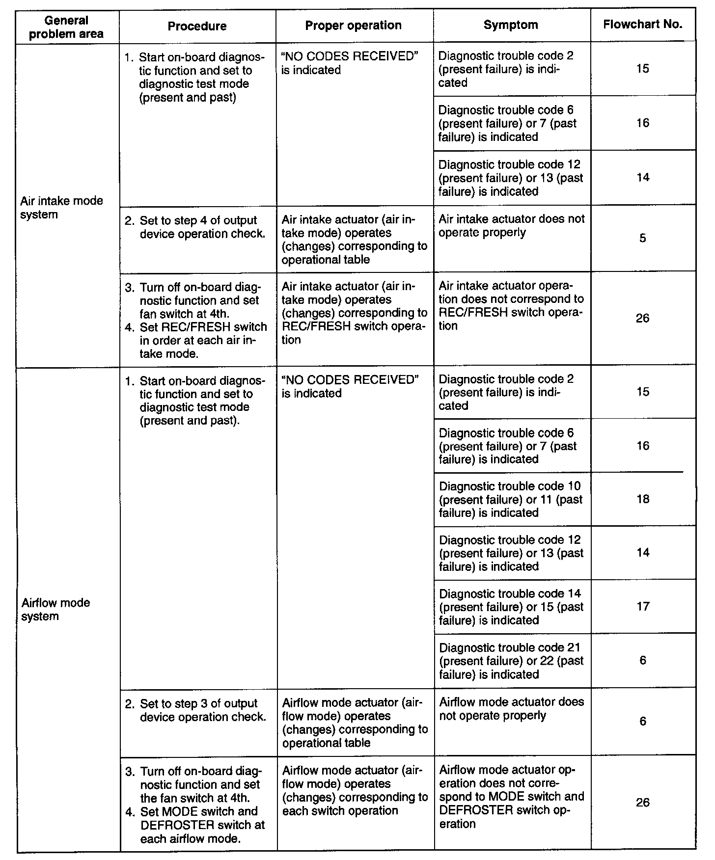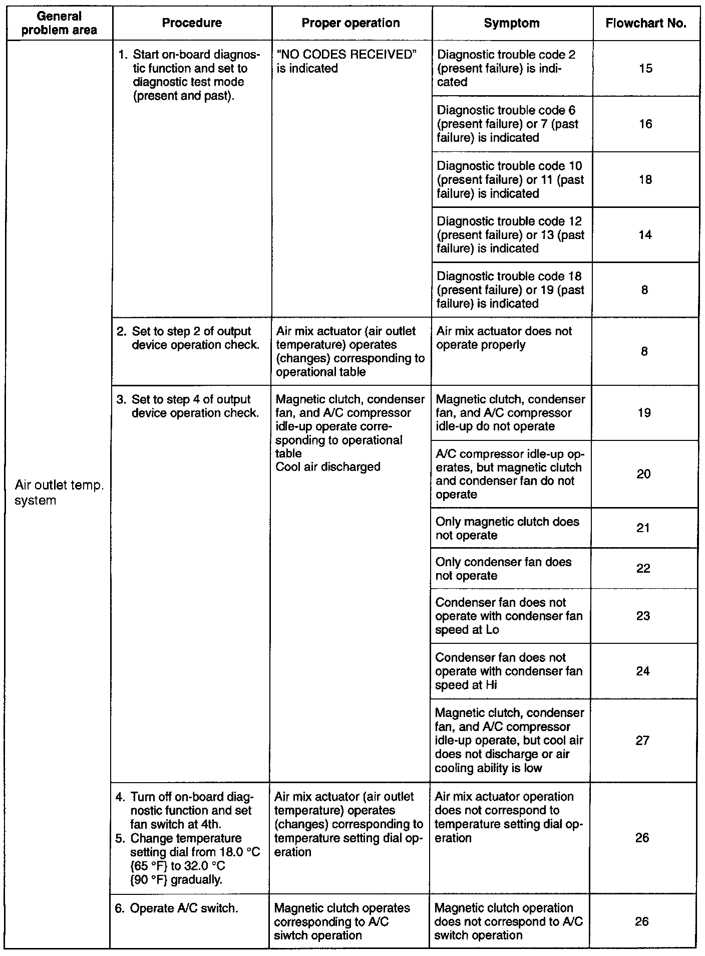 If the system does not operate properly (third column), determine the symptoms and corresponding flow-chart number (fourth and fifth columns). Refer to the appropriate flowchart and troubleshoot the system.