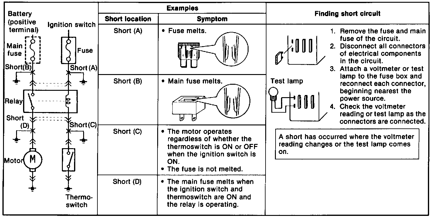 Shorts occur between the power (positive) and ground (negative) sides of a circuit. Therefore, finding a short circuit requires determining how the circuit is routed.Finding Short Circuits-Circuits Not Connected To Control Unit: