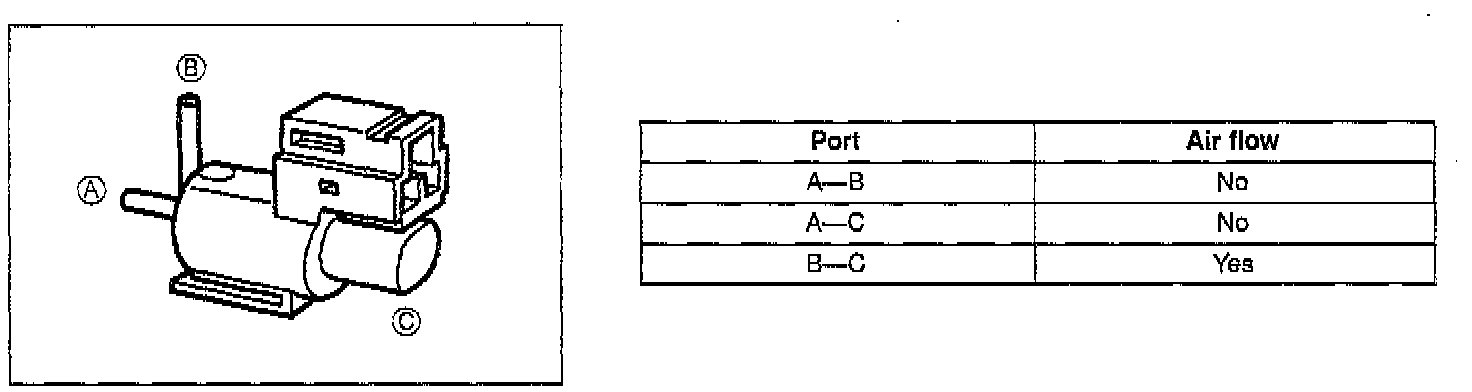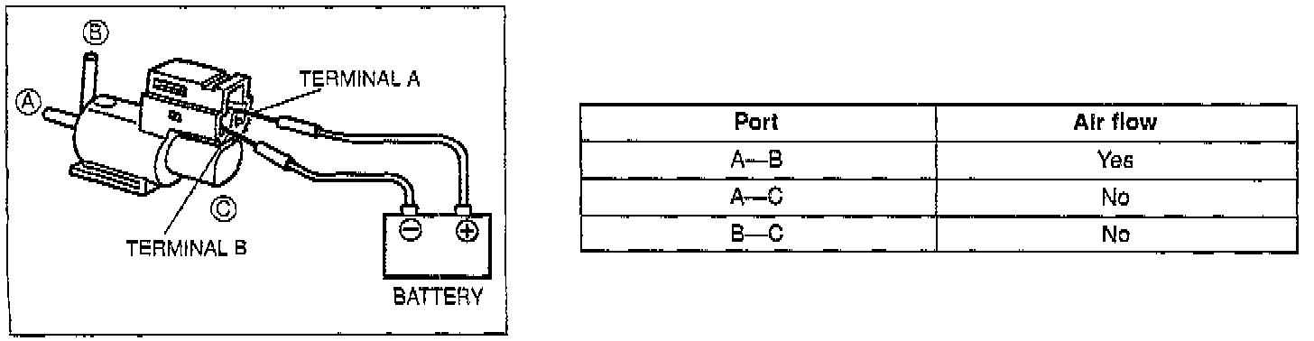 4. Apply battery positive voltage to terminal A and ground terminal B of the solenoid valve. Verify that air flows as shown below.