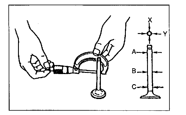 3. Measure the stem diameter of each valve in X and Y directions at the three points (A, B, and C) shown. Replace the valve if necessary.