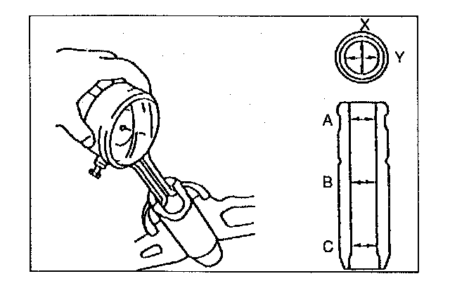 4. Measure the inner diameter of each valve guide in X and Y directions at the three points (A, B, and C) shown. Replace the valve guide if necessary.