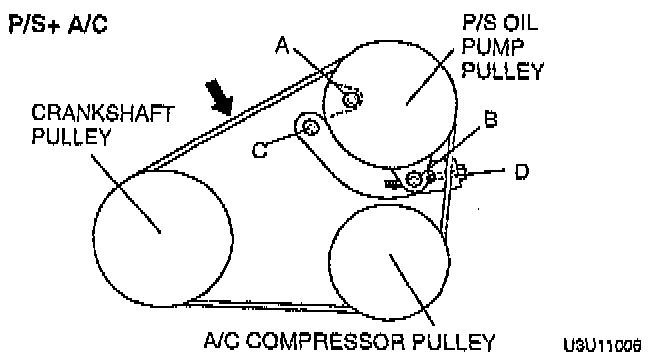 1. Loosen bolts and nuts A, B and C.2. Adjust the belt deflection by turning adjusting bolt D.