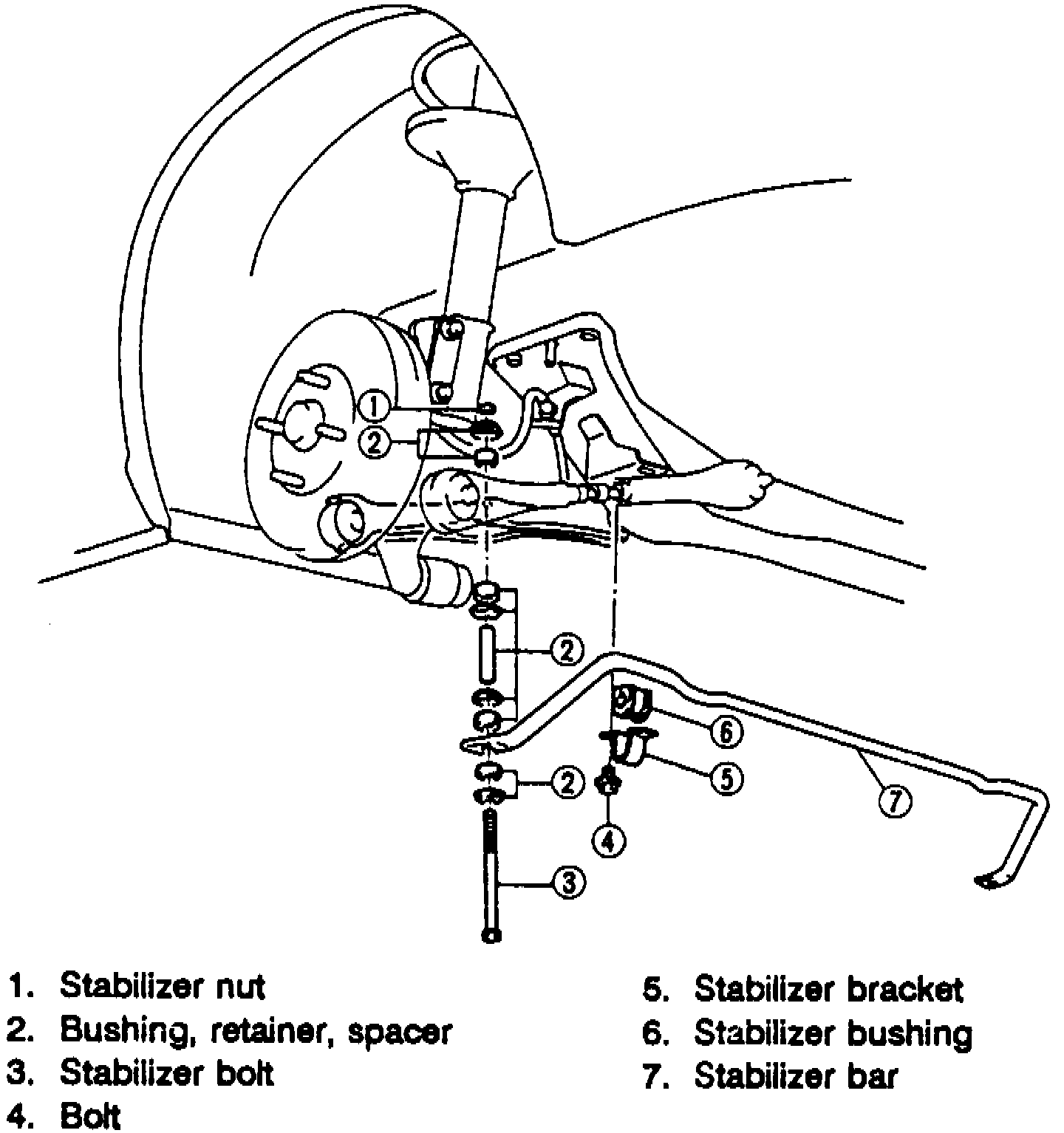 a. On 1993 - 94 models, tighten stabilizer nuts until 0.64 - 0.72 inch is exposed at end of bolt.