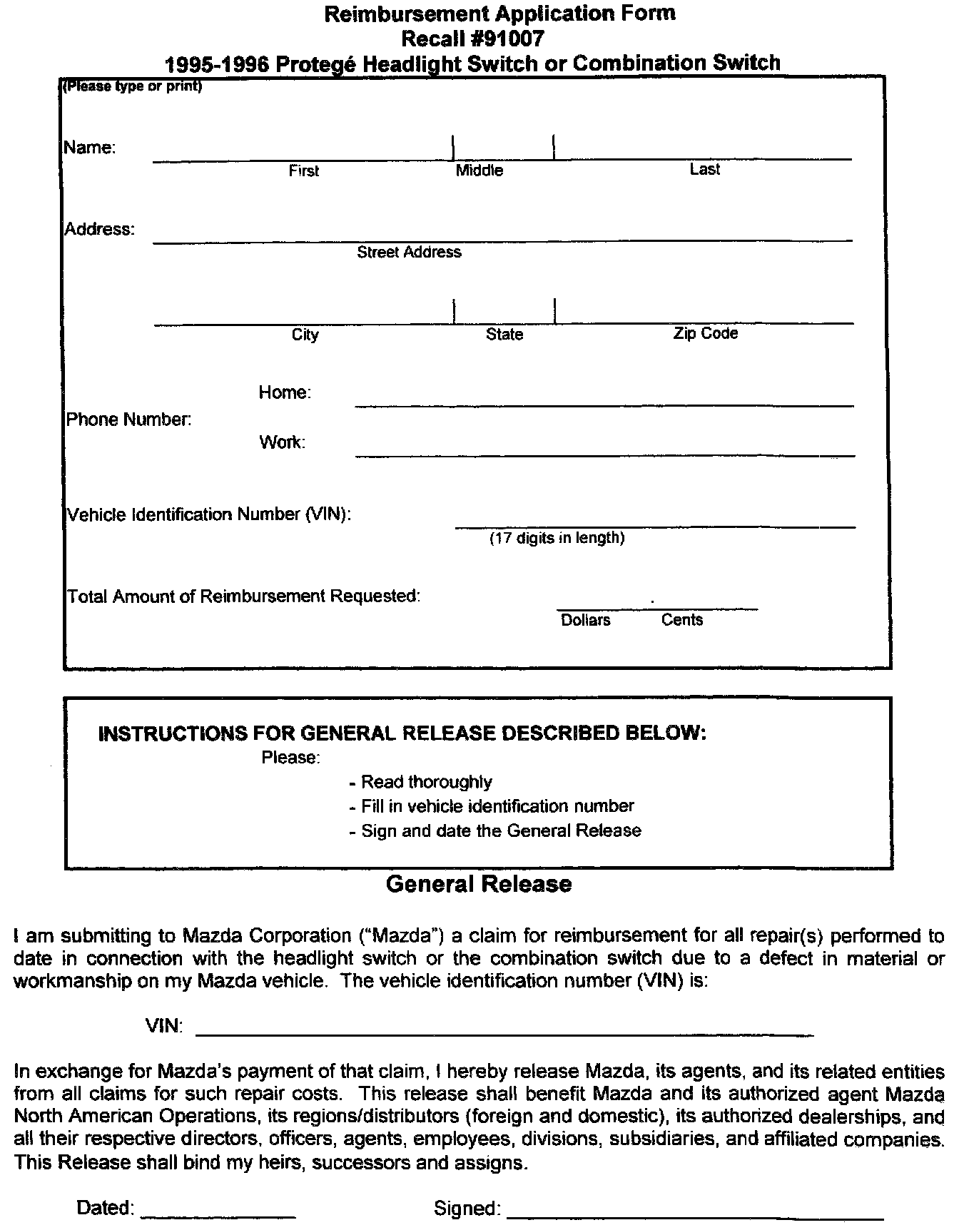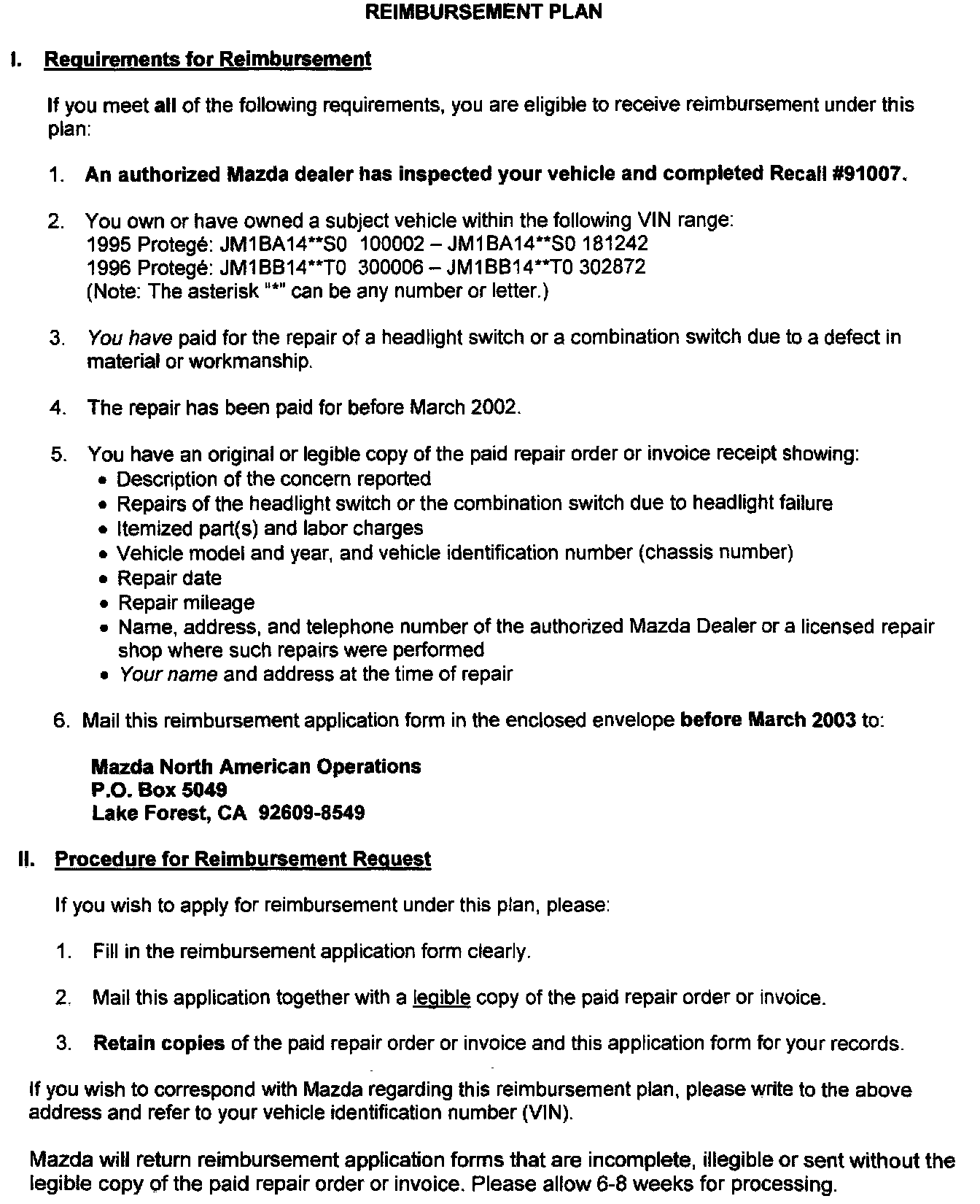 The reimbursement program has been extended through March 2003. Owners of affected vehicles will receive a reimbursement application form shown.