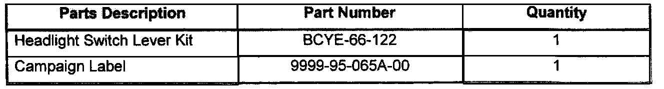 CONDITION OF CONCERNThe headlight switch wire may be subject to bending fatigue. Over time, while the turn signal lever is being used, there is a possibility that this may cause the headlight switch wire to break. This could also lead to the intermittent loss of the headlights and could potentially result in total loss of the headlights.