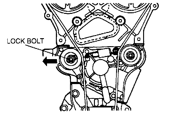 (2) Pull the tensioner pulley in the direction of the arrow to reduce tension of the timing belt, and remove the belt.