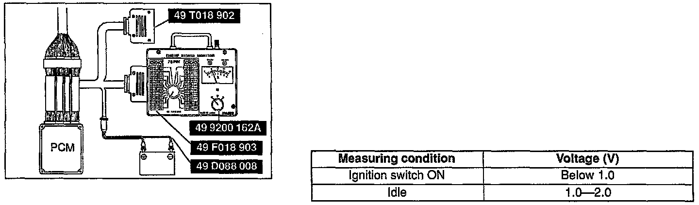 5. If not as specified, inspect the harness and connector between the mass air flow sensor and the PCM terminal.