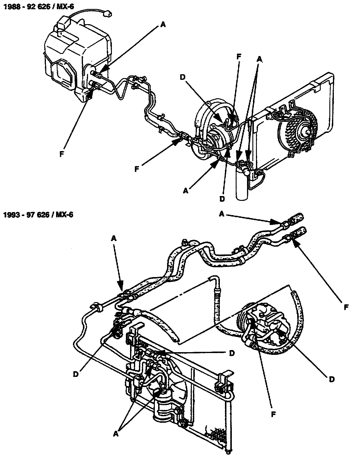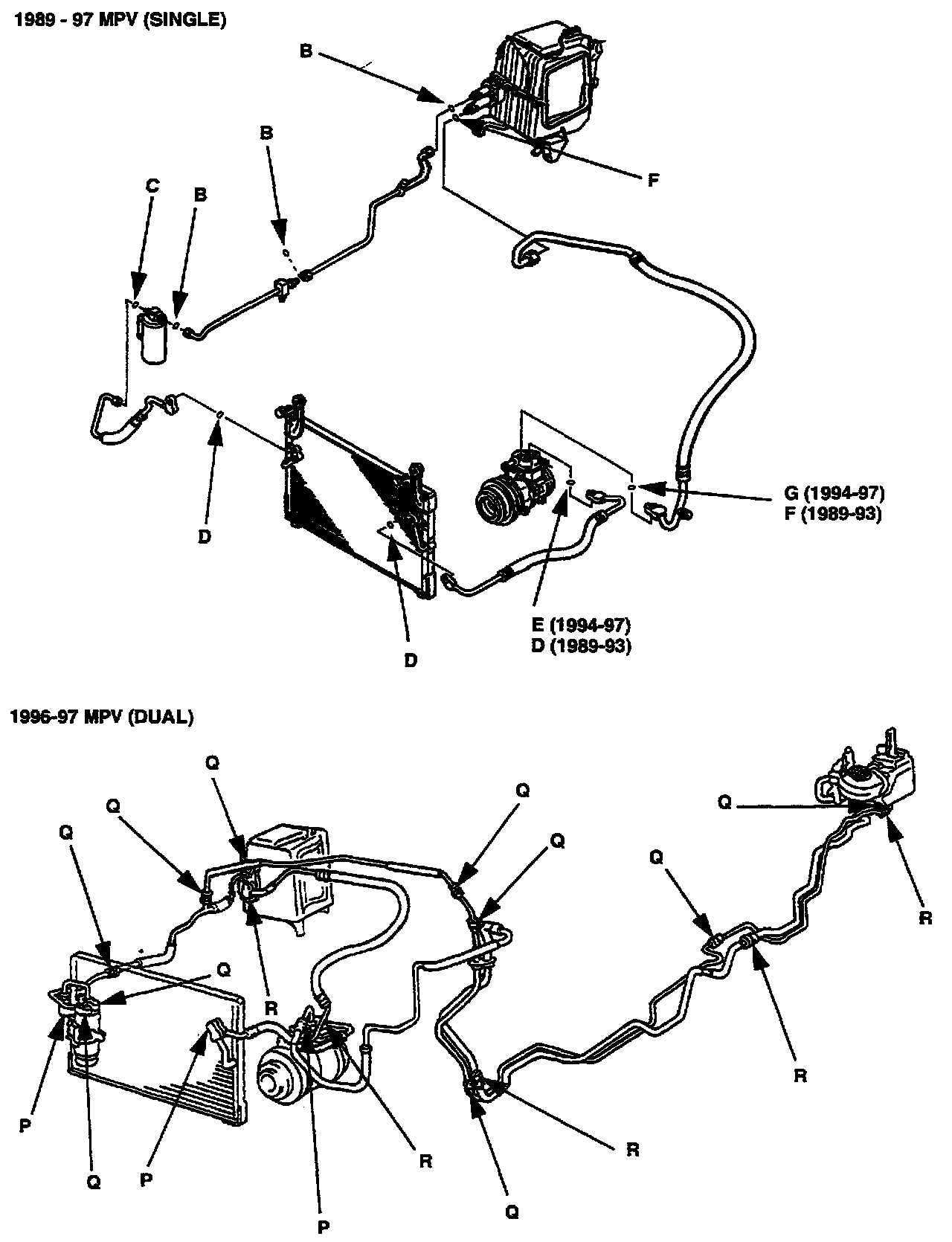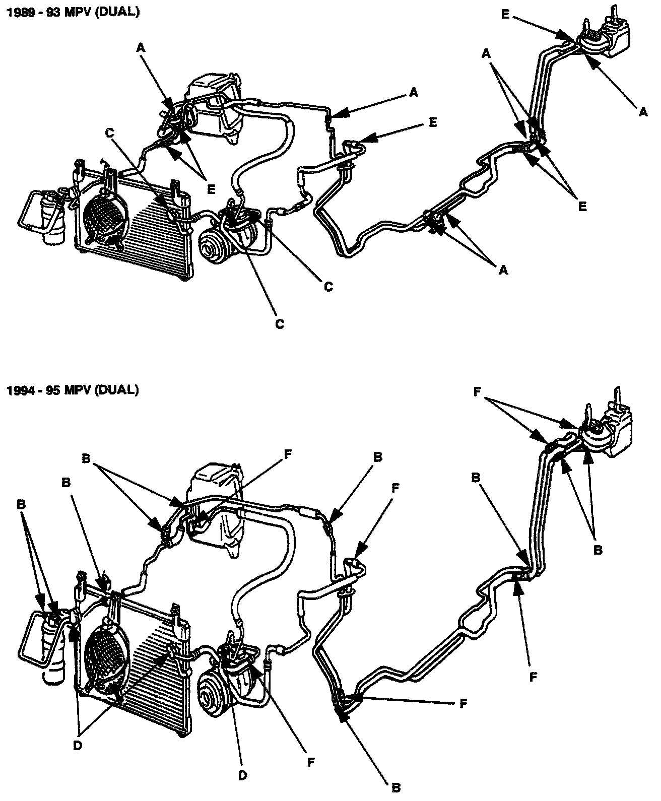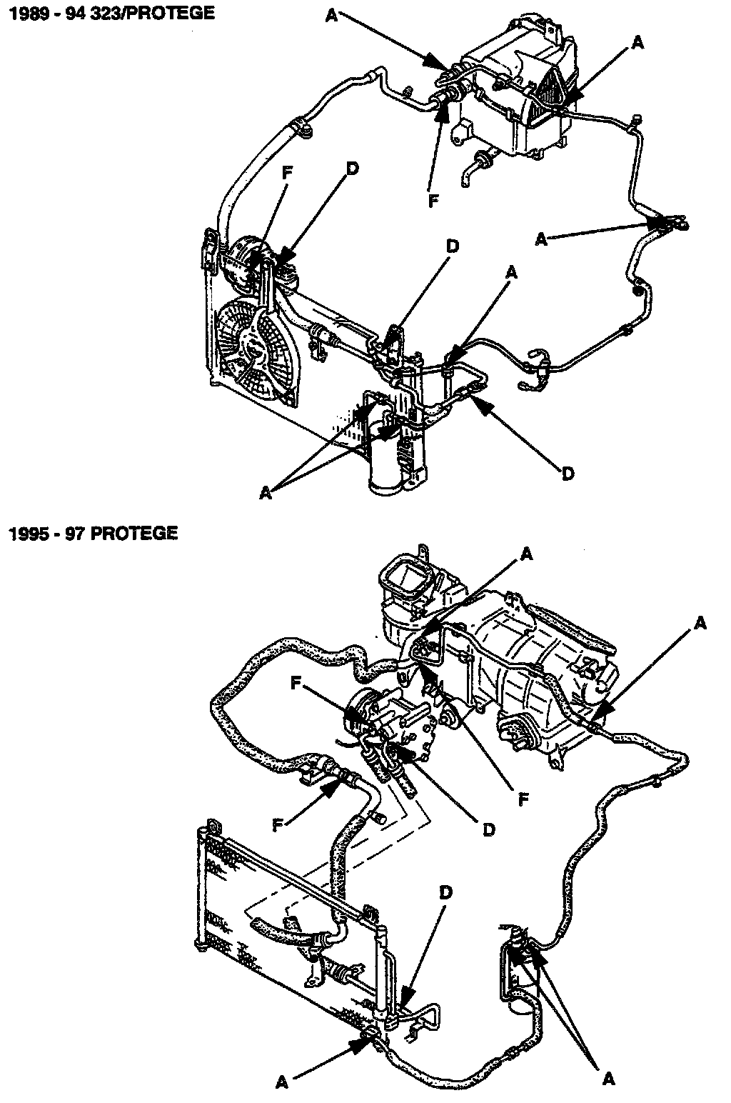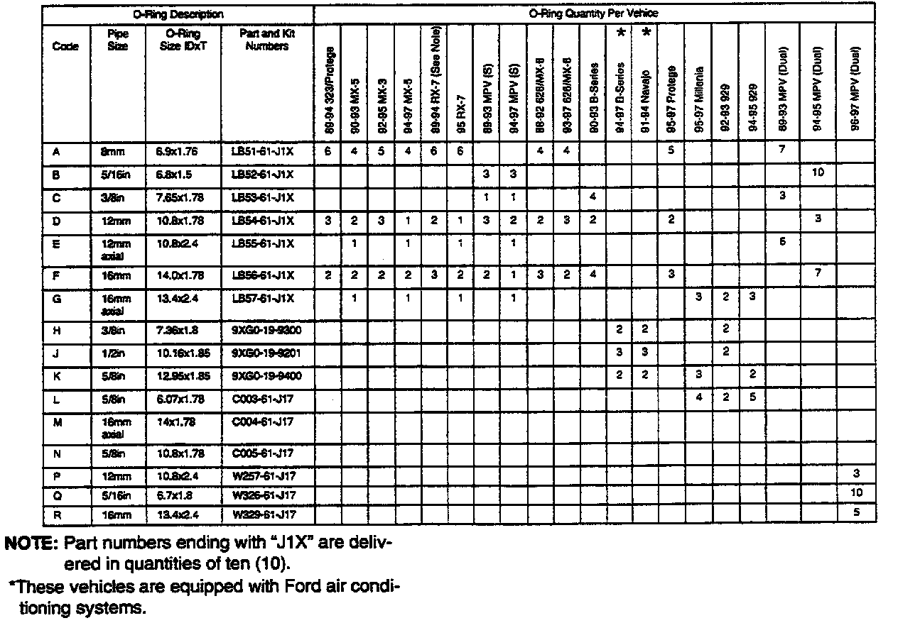 Refer to the appropriate illustration as shown and the chart when replacing A/C system 0-rings. These 0-rings are designed for use in both R-12 and R-134a systems.