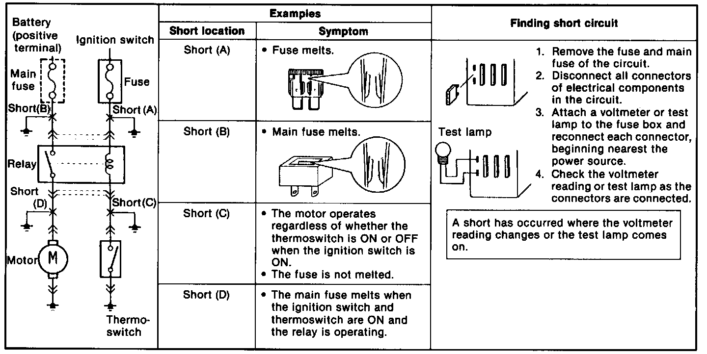 Shorts occur between the power (positive) and ground (negative) sides of a circuit. Therefore, finding a short circuit requires determining how the circuit is routed.Finding Short Circuits-Circuits Not Connected To Control Unit: