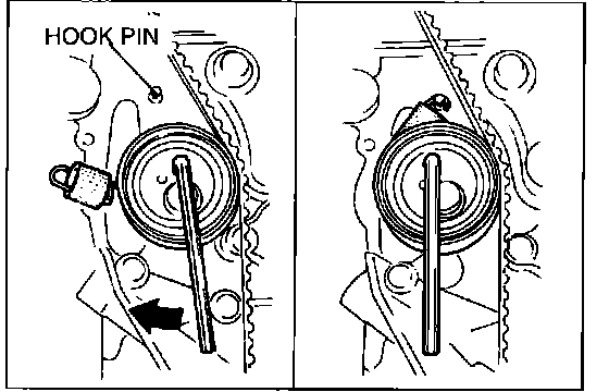 6. Turn the tensioner clockwise by using an Allen wrench and connect the tensioner spring to the hook pin. Verify that tension is applied to the timing belt.