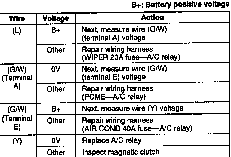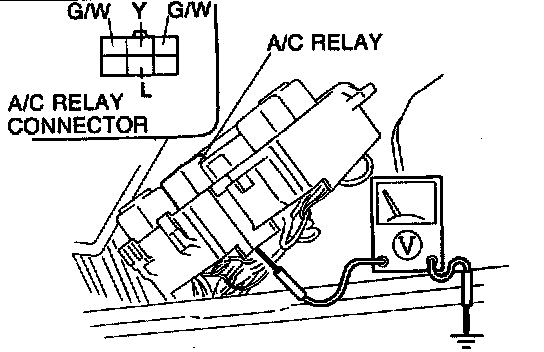 Measure the voltage at following terminal wires of the A/C relay connector.