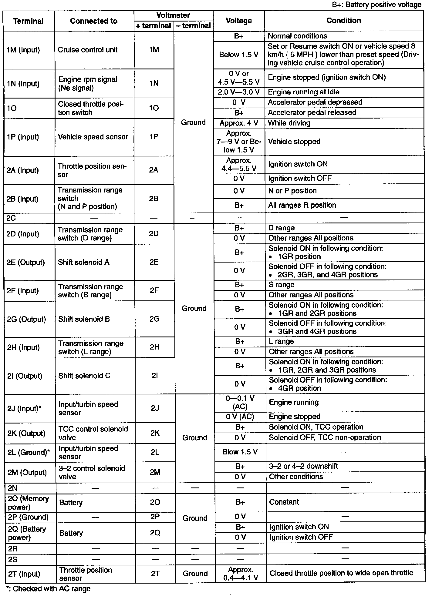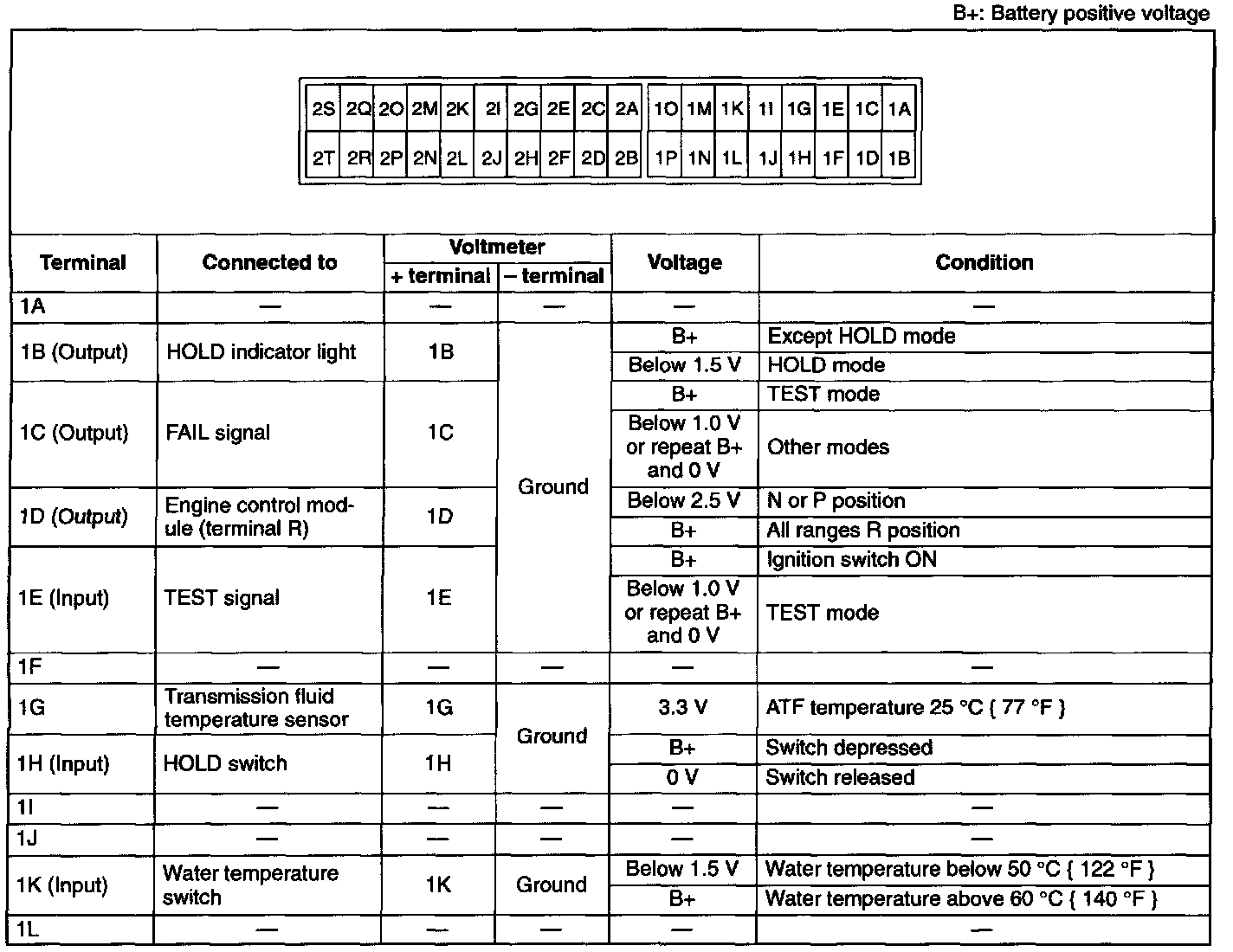 NOTE: Use the ground of terminal 2P of the transmission control module when measuring terminal voltage, as an error may occur when connecting the negative (-) circuit tester to ground.
