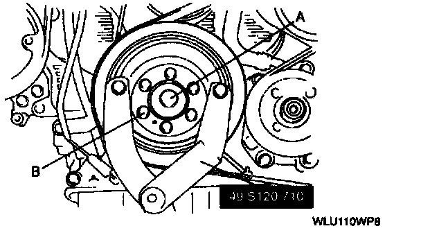 3. Remove timing belt pulley bolt A, then crankshaft pulley bolts B.