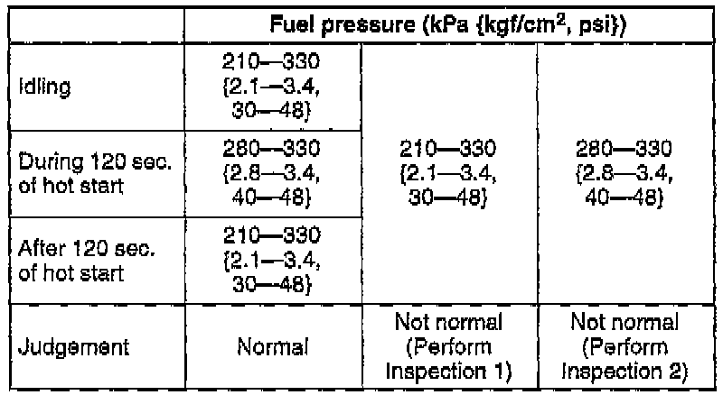3. If the fuel pressure is not within the specification, carry out either Inspection 1 or Inspection 2 as required.