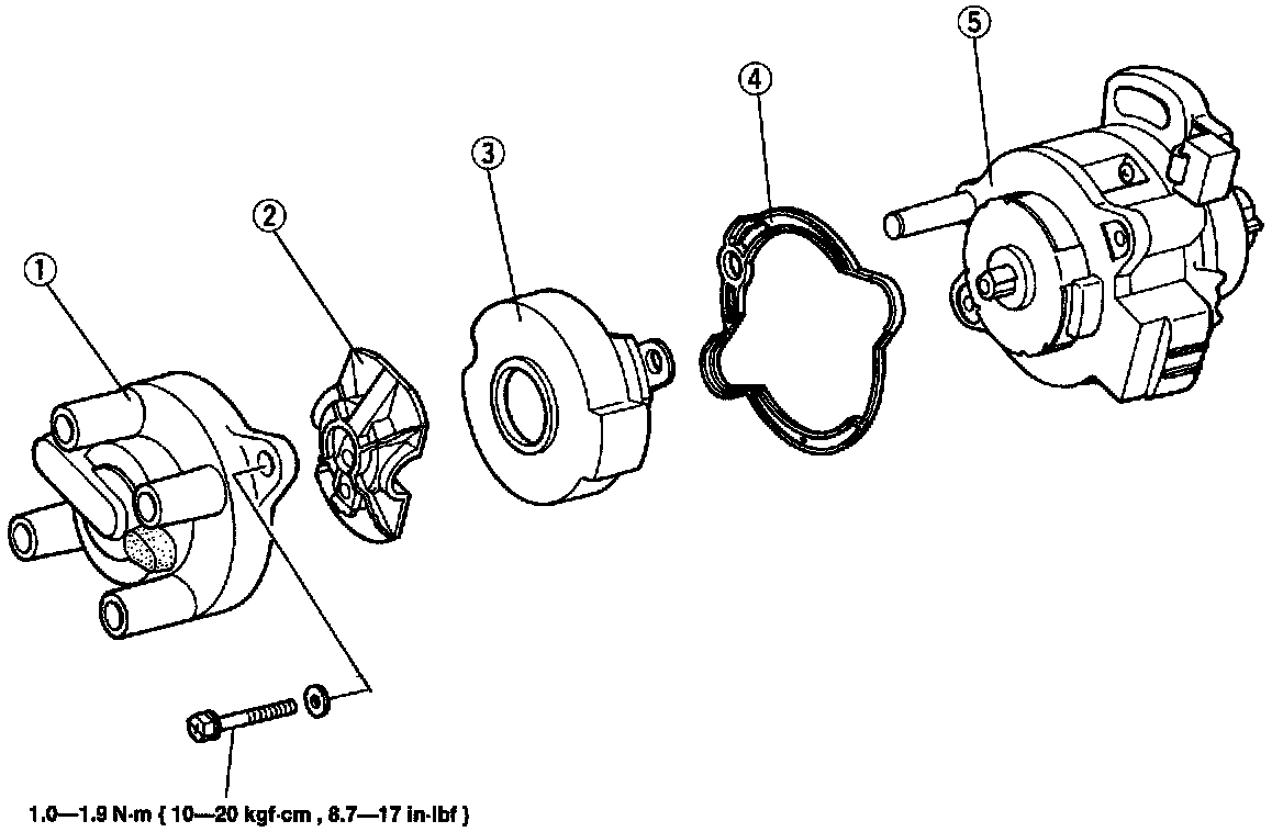 1. Distributor cap 2. Rotor 3. Cover 4. Packing 5. Distributor: