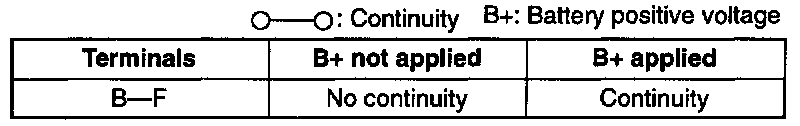 2. Apply battery positive voltage (B+) to terminal E and ground terminal A of the relay.