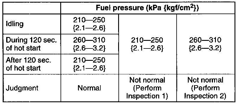 3. If the fuel pressure is not within the specification, carry out either Inspection 1 or Inspection 2 as required.