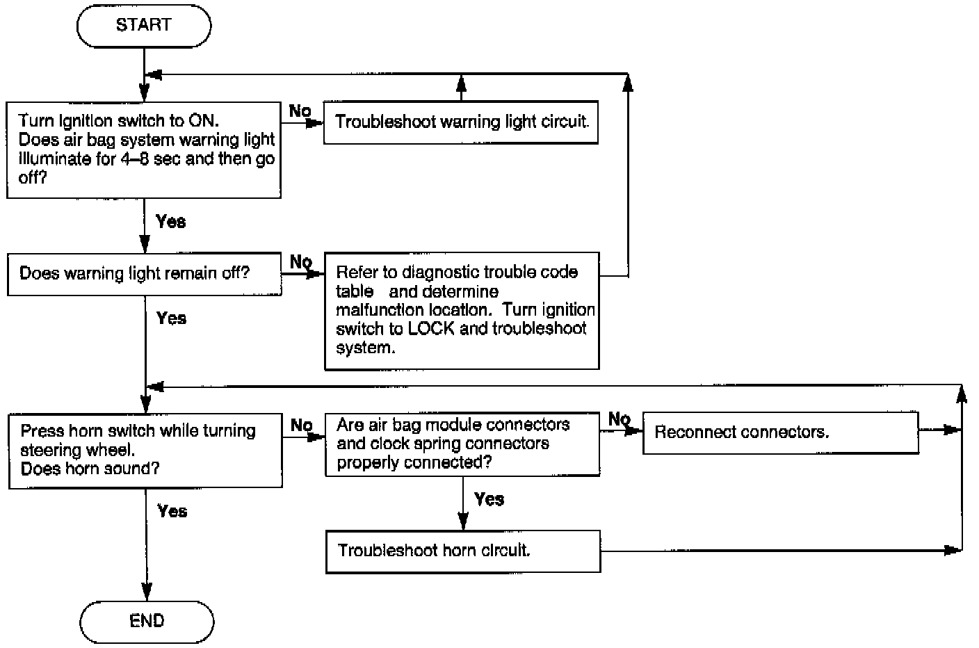 The SAS unit has an on-board diagnostic function that flashes or illuminates the air bag system warning light to indicate trouble in the air bag system. The trouble can be determined by the warning light illumination or flashing pattern. If the light does not illuminate but the system still has trouble, a warning buzzer will sound 5 cycles of 5 times each.Flowchart