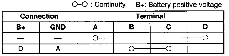 2. Connect battery positive voltage and check for continuity between the relay terminals as indicated above.