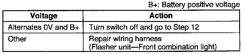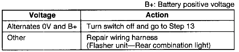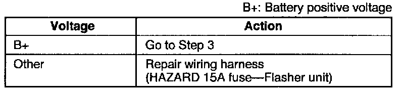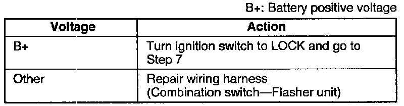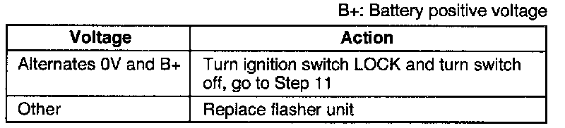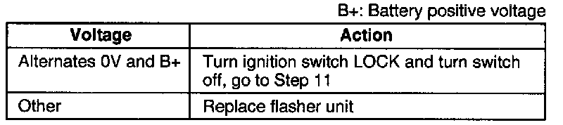 3. Set the turn switch to the left position and measure the voltage at terminal D (G/B) of the flasher unit connector.