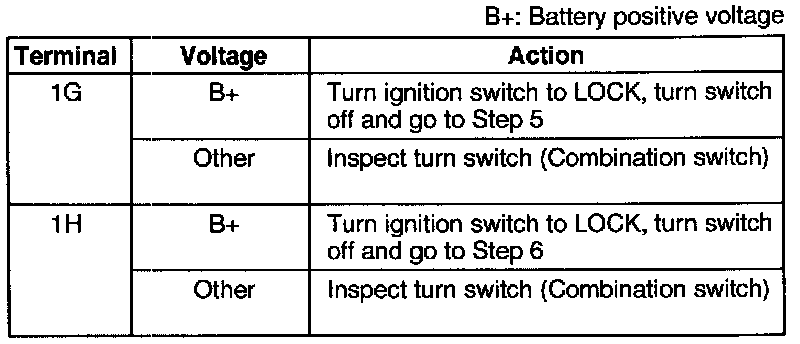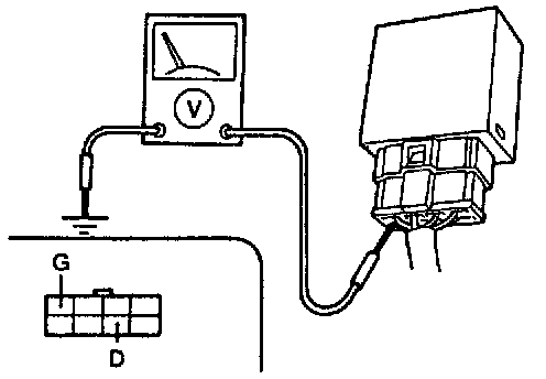 2. Set the turn switch to the right position and measure the voltage at terminal G (G/W) of the flasher unit connector.