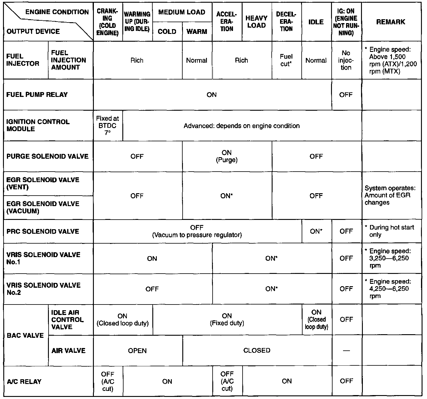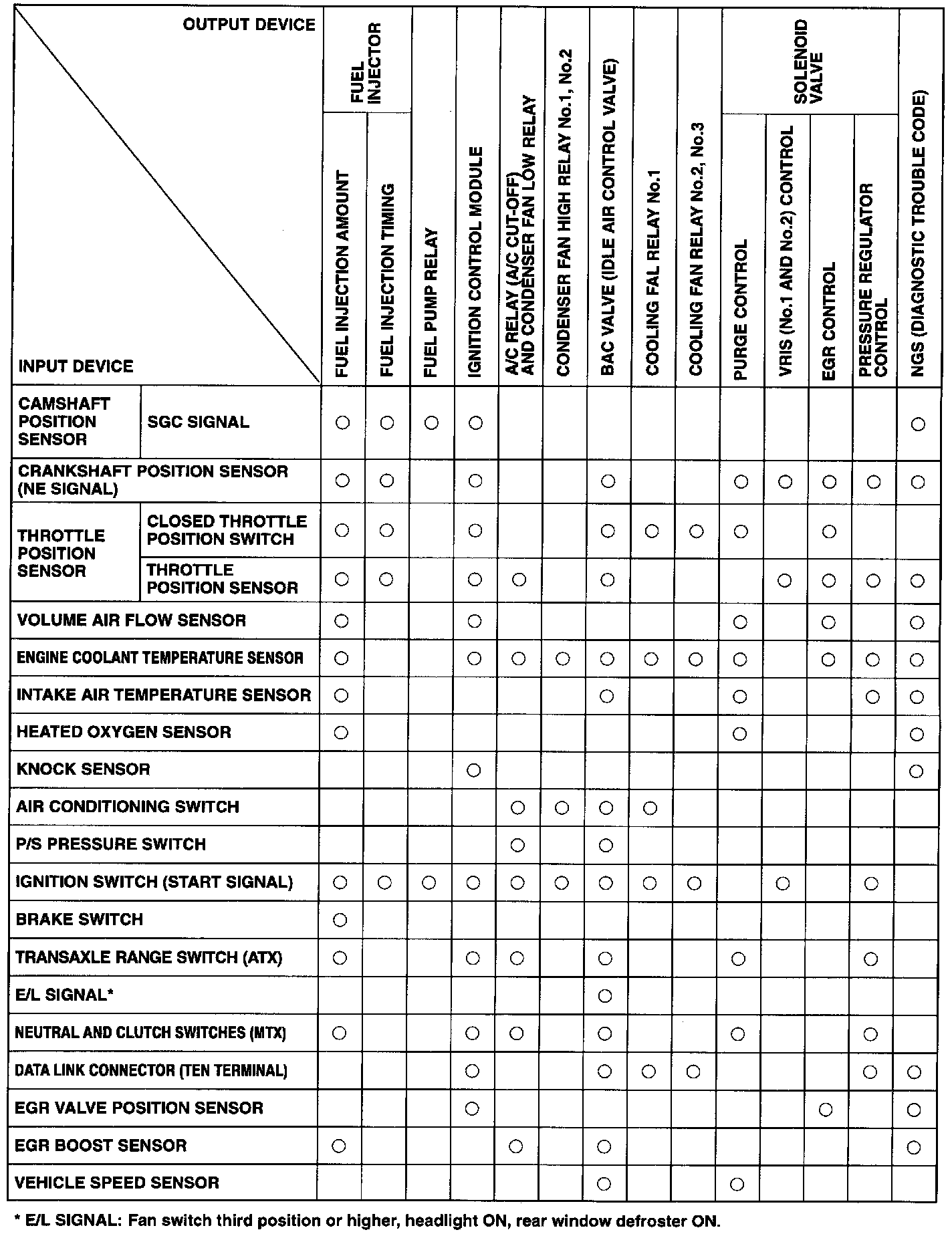OUTPUT DEVICES AND ENGINE CONDITION RELATIONSHIP CHART