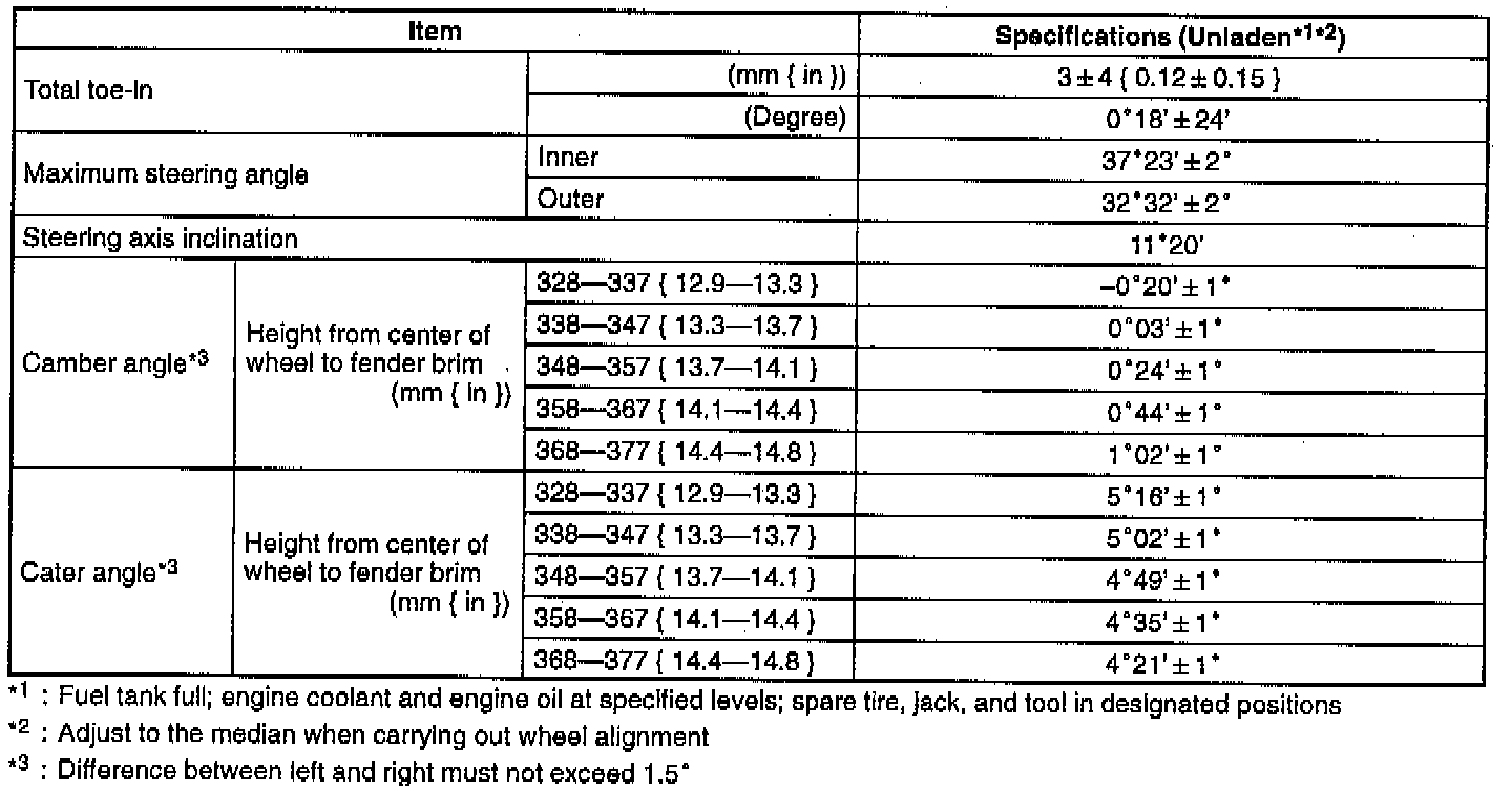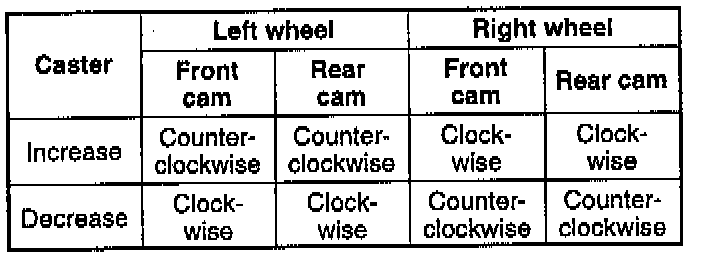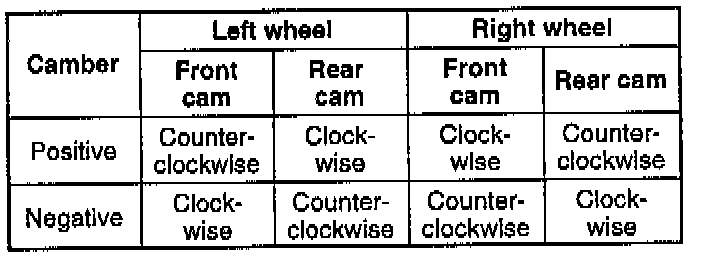 ^ Turning the front cam one graduation on the scale changes the caster angle about 22 minutes and the camber about 25 minutes. Turning the rear cam one graduation changes the caster angle about 22 minutes and the camber about 2 minutes.